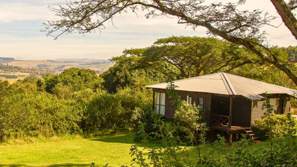 In the heart of the KZN Midlands Meander, Terry and Di Acres own a magnificent property called Midlands Forest Lodge.  Midlands Forest Lodge has eight timber log cabin chalets.  They are perched high up in Balgowan (5 hours from Johannesburg and 2 hours from Durban) on the edge of luscious green hills and slopes.  This tranquil and secluded hillside retreat has fifteen hectares of pristine indigenous mist-belt forest.  There are amazing flowers, trees and is a natural home to many varieties of birds.  At an altitude of 1340m, you can look over the unspoilt beauty of the Midlands valley.  Care has been taken in making the log cabins blend with nature.  Take a relaxed walk across the grassland or, for the more adventurous, explore the forest with its towering giant yellowwood trees.